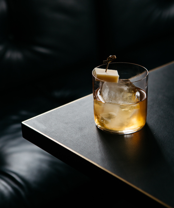 將所有原料加冰攪拌,濾入裝有冰條的洛克杯。以一小塊格魯耶爾奶酪裝飾。