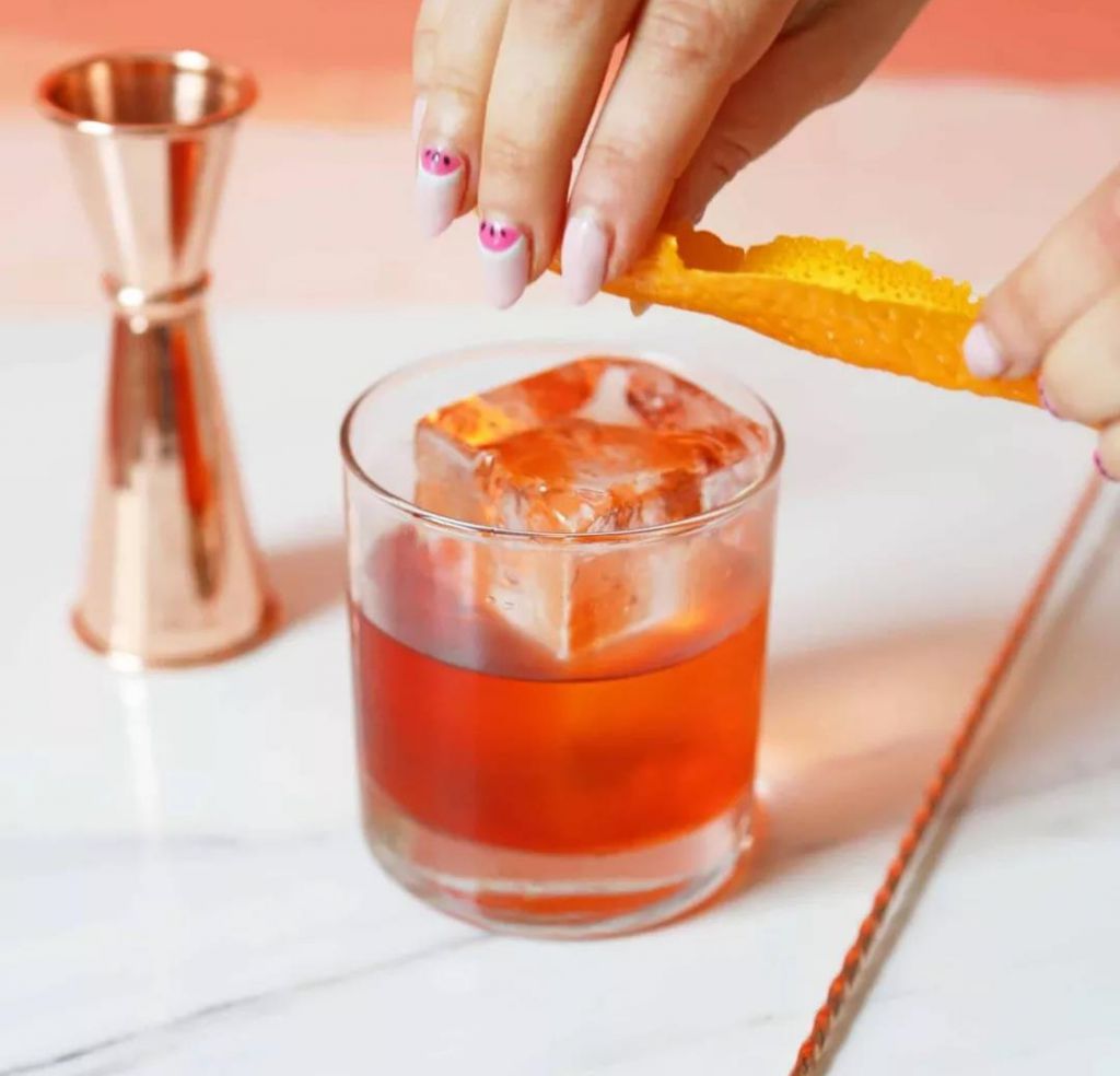 “切薄薄的一片橙皮,然后捏住它輕輕的將橙皮的油汁擠在雞尾酒上,能增添雞尾酒的額外的風(fēng)味。也可以將油汁擠在杯的外延的一圈,這樣就能在品嘗雞尾酒的同時(shí),能聞到橙子的清香,因?yàn)橐槐玫碾u尾酒不僅應(yīng)該喝起來好喝,同樣聞起來也要好。”