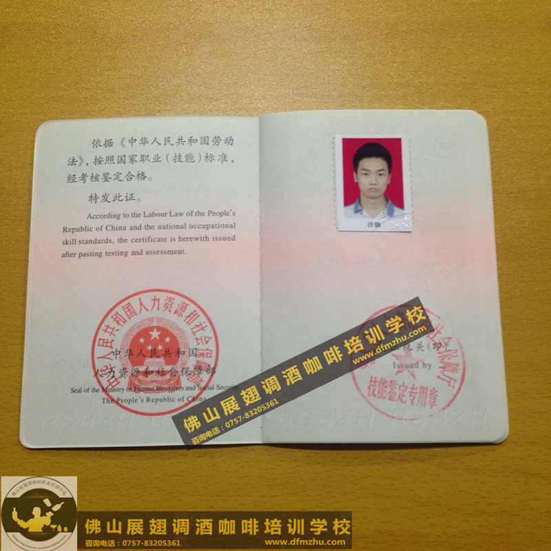 中英文版的職業(yè)資格證書出國通用。(調(diào)酒師、咖啡師、西點師職業(yè)資格證書)佛山展翅調(diào)酒咖啡西點培訓(xùn)學(xué)校畢業(yè)學(xué)生,100%通過率,順利拿到中華人民共和國人力資源和社會保障部,頒發(fā)的調(diào)酒師、咖啡師、西點師職業(yè)資格證書部分樣版。