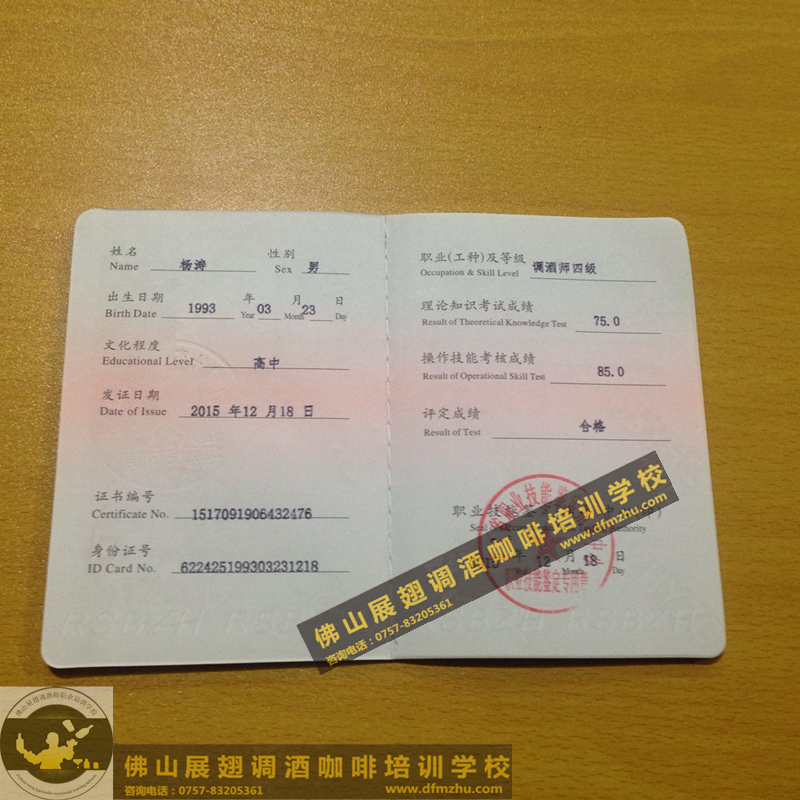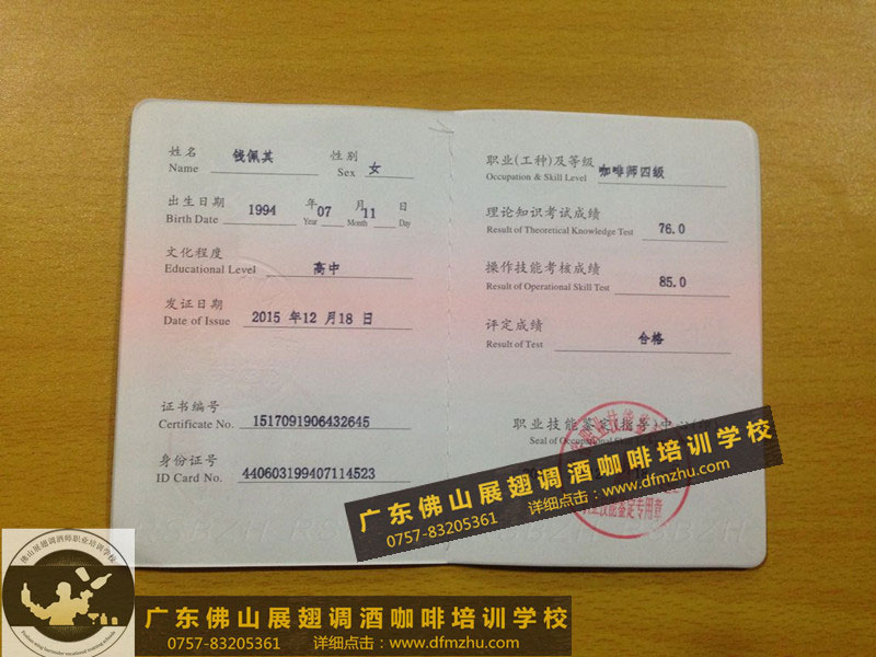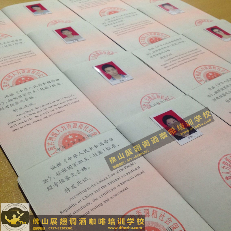 以下所有證書,都是佛山展翅調(diào)酒咖啡西點培訓(xùn)學(xué)校畢業(yè)學(xué)生,考取的調(diào)酒師、咖啡師、西點師職業(yè)資格證書,為了防止盜圖,全部加了水印。